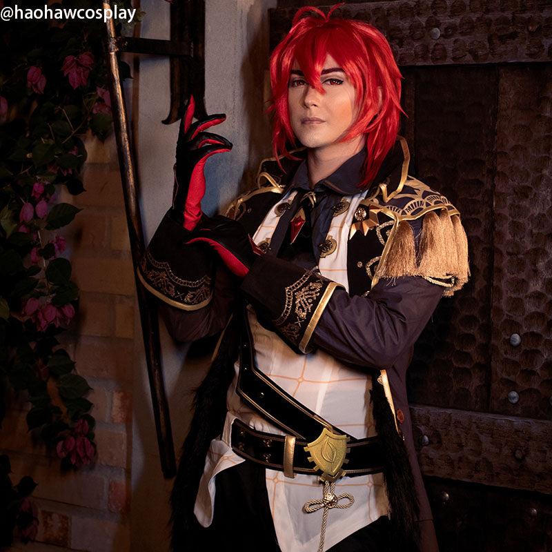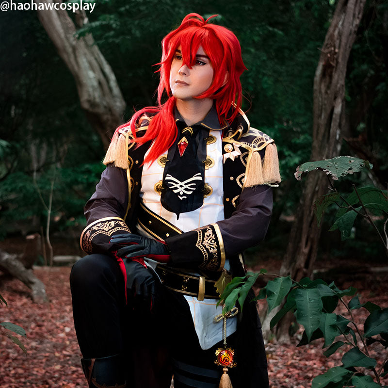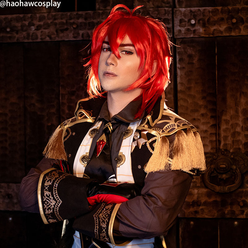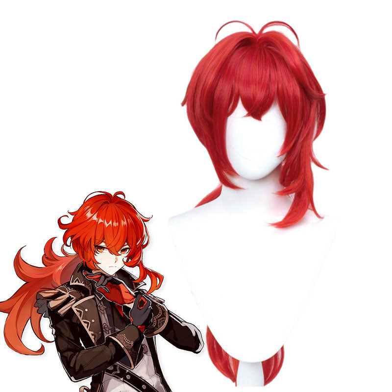 Eigenschaften : Diese Cosplay-Perücke basiert auf der Figur Diluc aus Genshin Impact. Diese modische Perücke kann auf Cosplay-Conventions und Halloween-Partys getragen werden.