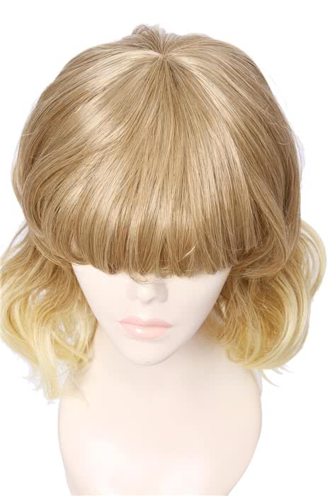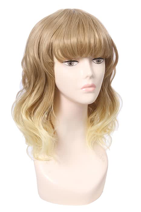 Women Synthetic Fashion Wigs Flaxen Mixed Blonde Medium Long Curly Wigs with Bangs