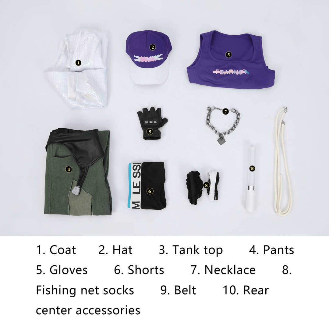 Includes full Ashe cosplay costume: hoodie, crop top, pants, belt.