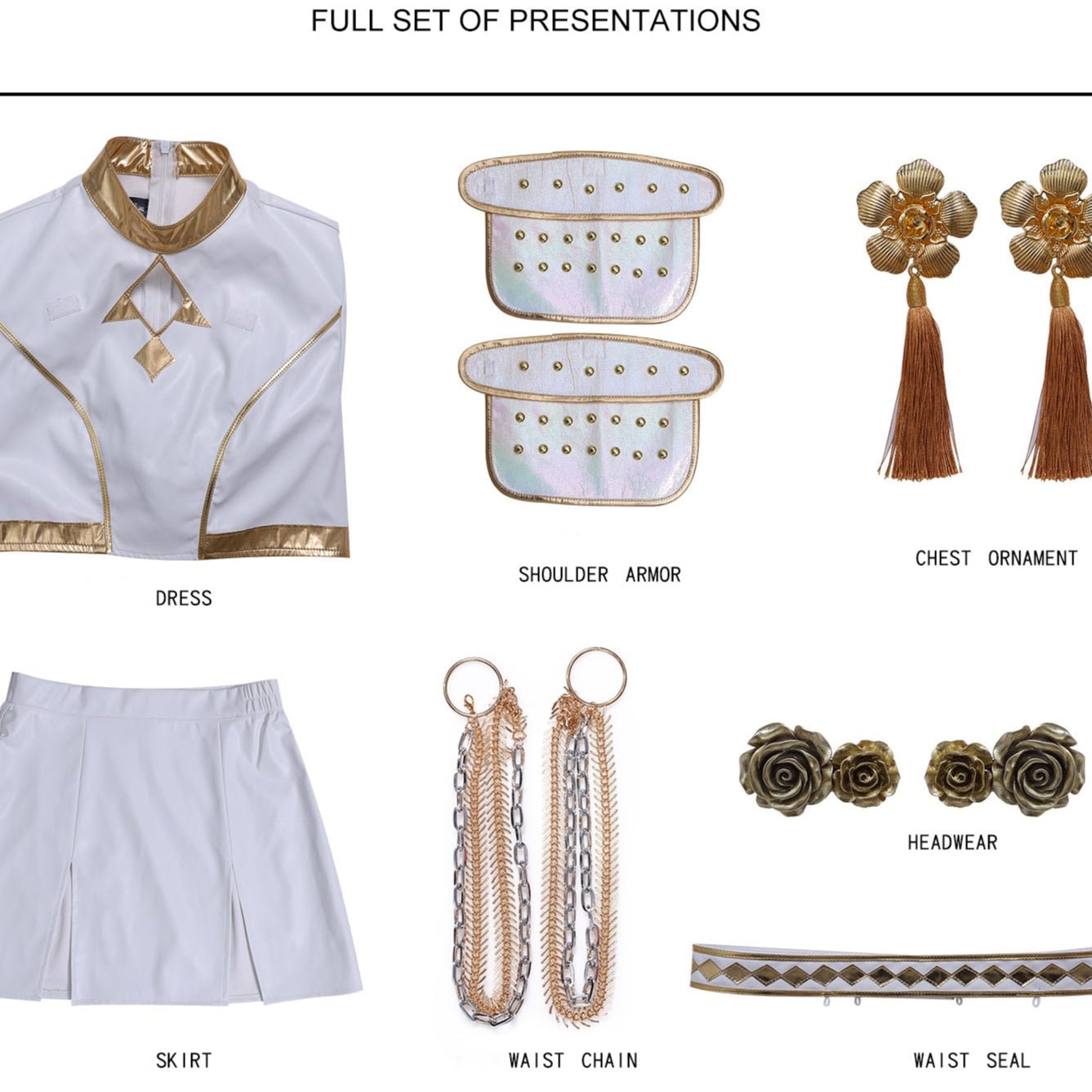 Set Includes:Top+Skirt+Shouder Armor+Chest Oranment+Headear+Waist Seal